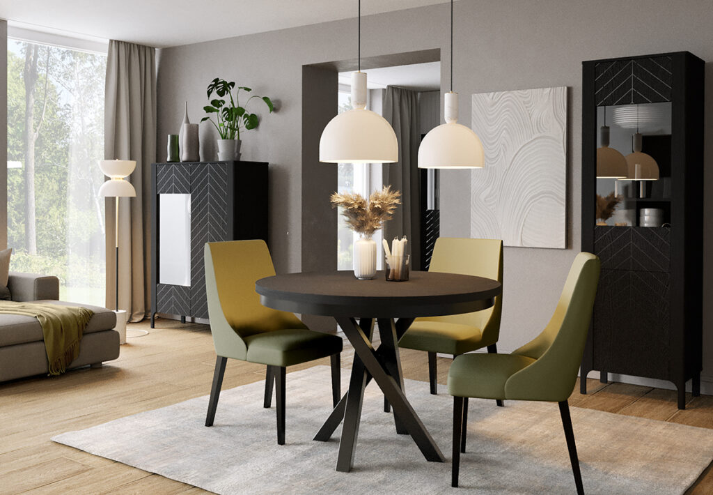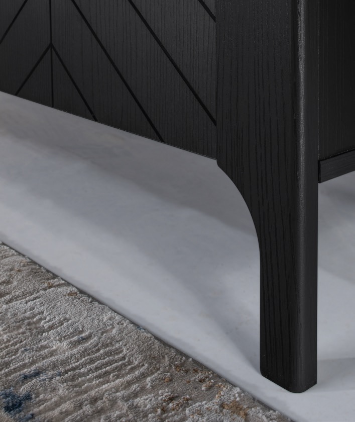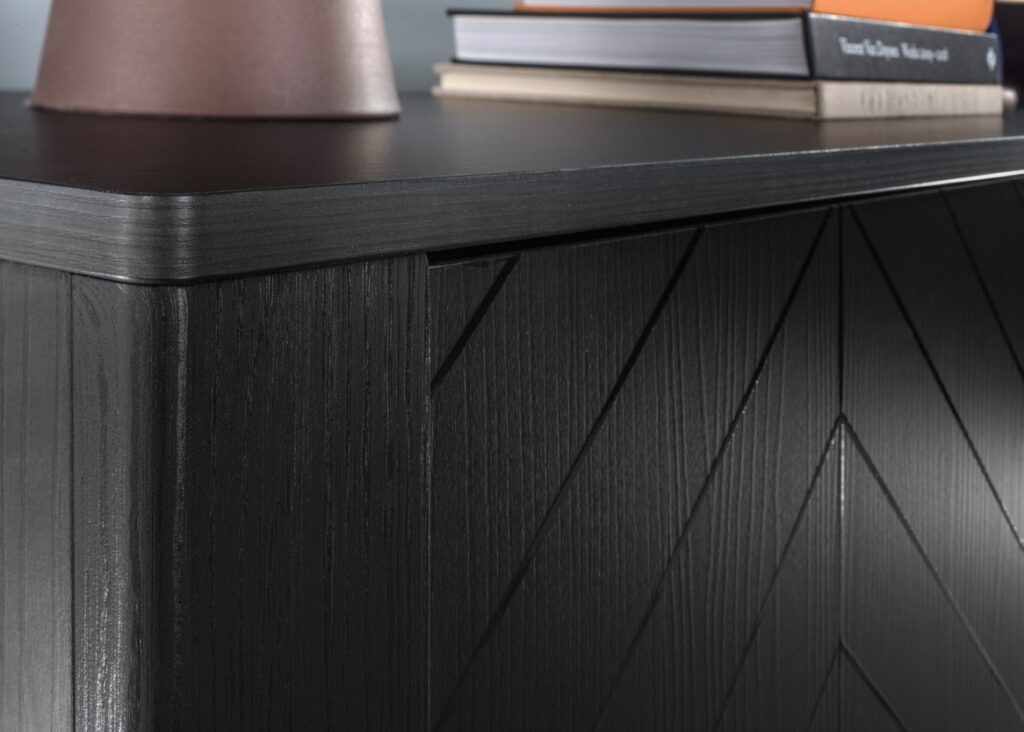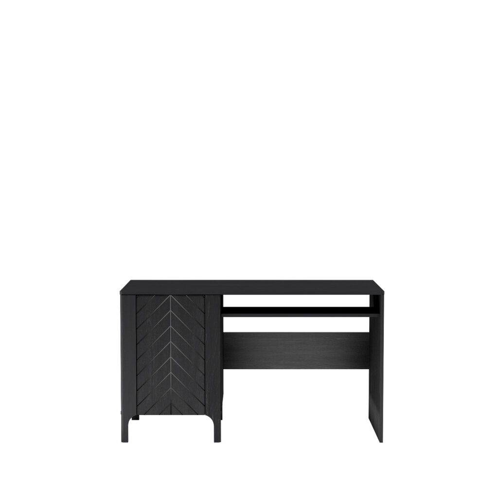Eleganckie, minimalistyczne biurko z wbudowaną szafką i ozdobnym frontem w jodełkę. Głęboka czerń i trwałe materiały zapewniają styl i funkcjonalność, idealne do biura, gabinetu czy pokoju młodzieżowego.