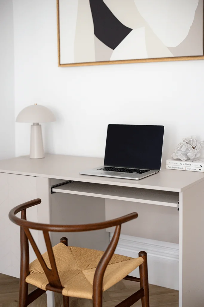 Eleganckie, minimalistyczne biurko z wbudowaną szafką i ozdobnym frontem w jodełkę. Trwałe materiały zapewniają styl i funkcjonalność, idealne do biura, gabinetu czy pokoju młodzieżowego.