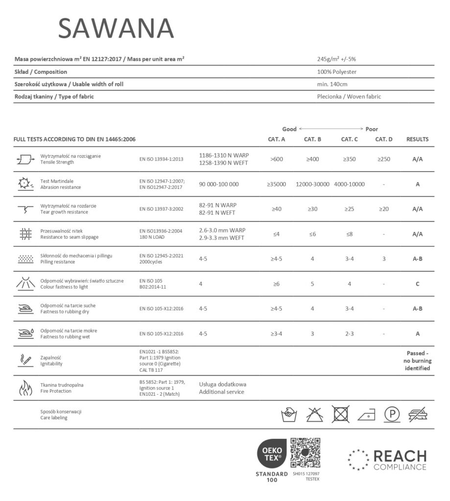 Materiał nie tylko zachwyca wyglądem, ale także imponuje trwałością. Jest odporny na działanie światła, pilingi i ścieranie, co oznacza, że zachowa swoje piękno i jakość przez długi czas. Co więcej, Sawana posiada trudnozapalne właściwości, co jest istotne w kwestiach bezpieczeństwa.