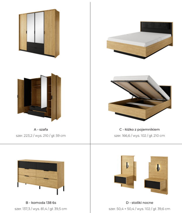 Czarne akcenty to aktualny trend wnętrzarski. Harmonijne połączenie jasnego, ciepłego drewna w kolorze dębu baltic z dodatkami w klasycznej czerni to świetny sposób na wprowadzenie tego designu do wnętrz. Szuflady w szafie i stolikach nocnych oraz część w komodzie posiadają ryflowane fronty MDF w kolorze czarnym, co, wraz z czarnymi, metalowymi nogami i uchwytami, podkreśla wyjątkowy, nowoczesny charakter kolekcji.