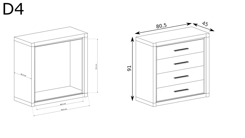 Komoda z kolekcji Dallas posiadająca cztery pojemne szuflady, które pomagają w codziennej organizacji oraz pozwalają na utrzymanie ładu i porządku. Mebel jest prosty lecz, poprzez czarne listwy staje się oryginalny, łamie standardy i szokuje. Pomieści wiele ubrań, akcesoriów a swoje miejsce znajdzie w każdym pomieszczeniu i wszędzie będzie pasować. Dostępna w dwóch wybarwieniach.