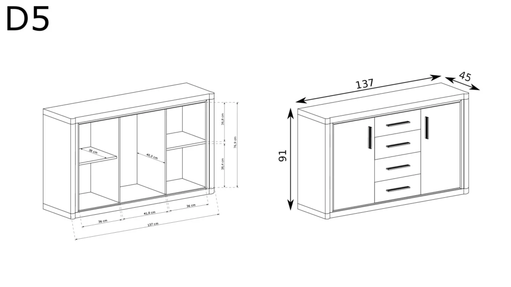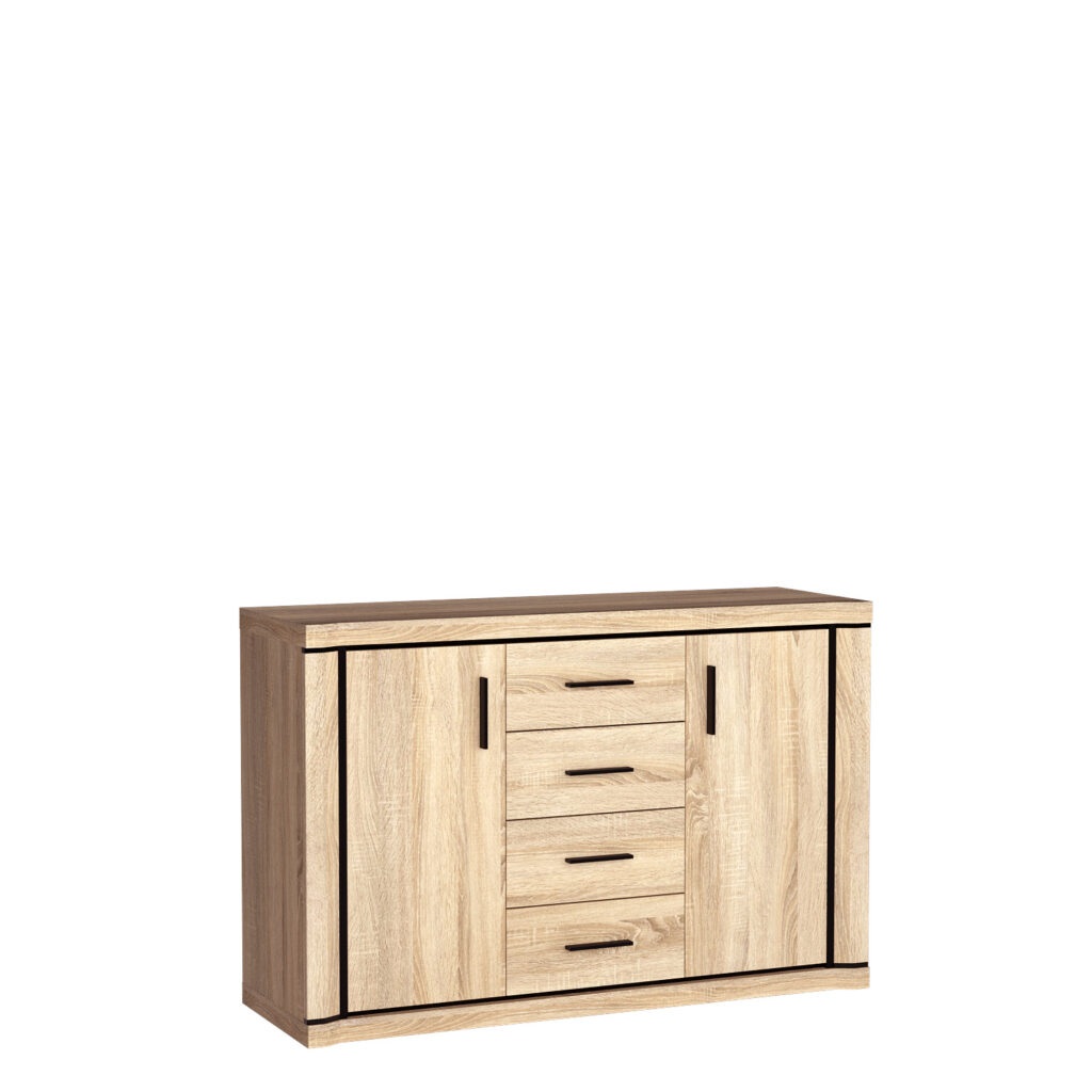 Pojemna komoda z kolekcji Dallas, która pozwala na ułatwienie codziennej organizacji. Komoda posiada cztery duże szuflady oraz dwie szafki, w których znajduję się po jednej półce, które dzielą ogromną przestrzeń i pozwalają na jej zagospodarowanie. Mebel jest zdobiony czarnymi wstawkami w formie listew, dodają one wiele elegancji oraz wprowadzają oryginalny wystrój. Komoda pasuje do salonu, sypialni, a także do biura czy gabinetu. Dostępna w dwóch wybarwieniach.