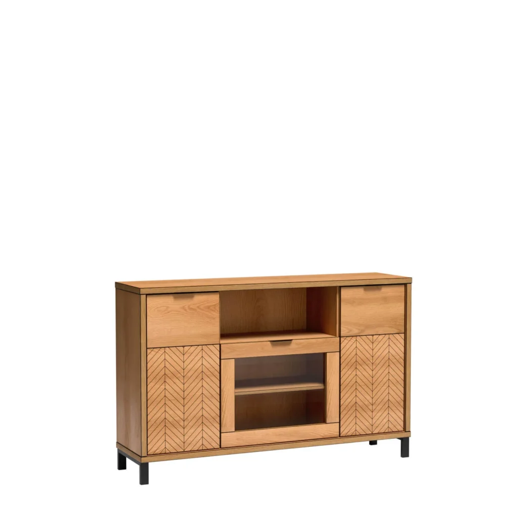 Praktyczna komoda z kolekcji FONTI w kolorze dąb karmel. Po bokach mebla znajdziemy szafki z jedną półką, w których pomieści się wiele rzeczy. Centrum komody wita nas szafką z przeszklonym frontem, w której znajdziemy półkę dzielącą przestrzeń na pół. Nad szafką znajdziemy półkę na różne drobiazgi.