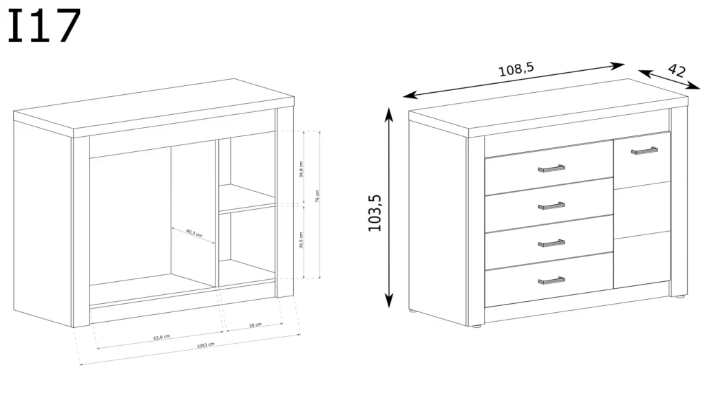 Duża, stabilna i wytrzymała komoda. Posiada cztery pojemne szuflady, w których można przechować wiele ubrań, dokumentów, akcesoriów. Po boku znajduje się szafka z półką w środku, która dzieli przestrzeń na pół, można przez to wykorzystać miejsce mebla w 100%. Komoda idealnie sprawdza się w sypialni, salonie, ale tak i w biurze i gabinecie. Mebel wpasuje się w wiele aranżacji, ale nawet sam wygląda dobrze i wpada w oko. Metalowe uchwyty podkreślają oryginalność mebla.