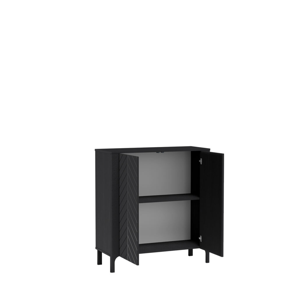 Dodaj elegancji i funkcjonalności do swojego wnętrza dzięki tej wyjątkowej szafce o nowoczesnym designie. Wykonana z wysokiej jakości materiałów, charakteryzuje się matowym wykończeniem oraz subtelnym wzorem w jodełkę, który dodaje jej klasy i stylu. Wyrafinowany wzór w jodełkę na frontach podkreśla minimalistyczny charakter mebla. Przestronna półka wewnątrz zapewnij dużo miejsca do przechowywania Twoich rzeczy. Doskonała do mniejszych przestrzeni, takich jak przedpokój, salon czy sypialnia. Stabilna konstrukcja i trwałe materiały gwarantują długowieczność mebla.Ten mebel jest nie tylko praktyczny, ale również estetycznie dopasuje się do każdego wnętrza, od nowoczesnych przestrzeni po te urządzone w stylu klasycznym.
