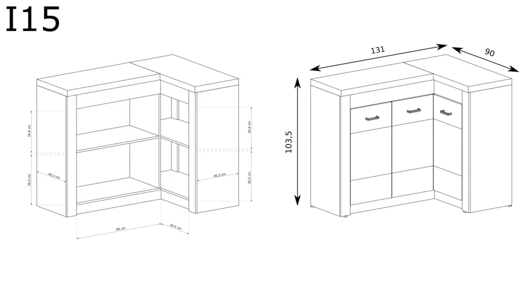 Komoda narożna z kolekcji Indianapolis. Szafki po lewej stronie są połączone i tworzą całość. Znajduję się w niej jedna pojemna półka tak jak i w prawej stronie. Komoda daje dużo możliwości co do jej wykorzystania. Jest pojemna, dzięki niej organizacja jest bardzo łatwa, komoda wpasuje się w każdy kąt. Dostępna jest również wersja odwrotna mebla. Metalowe uchwyty idealnie wpajają się w całość mebla, pokazując przy tym, jak bardzo jest przemyślany każdy detal.