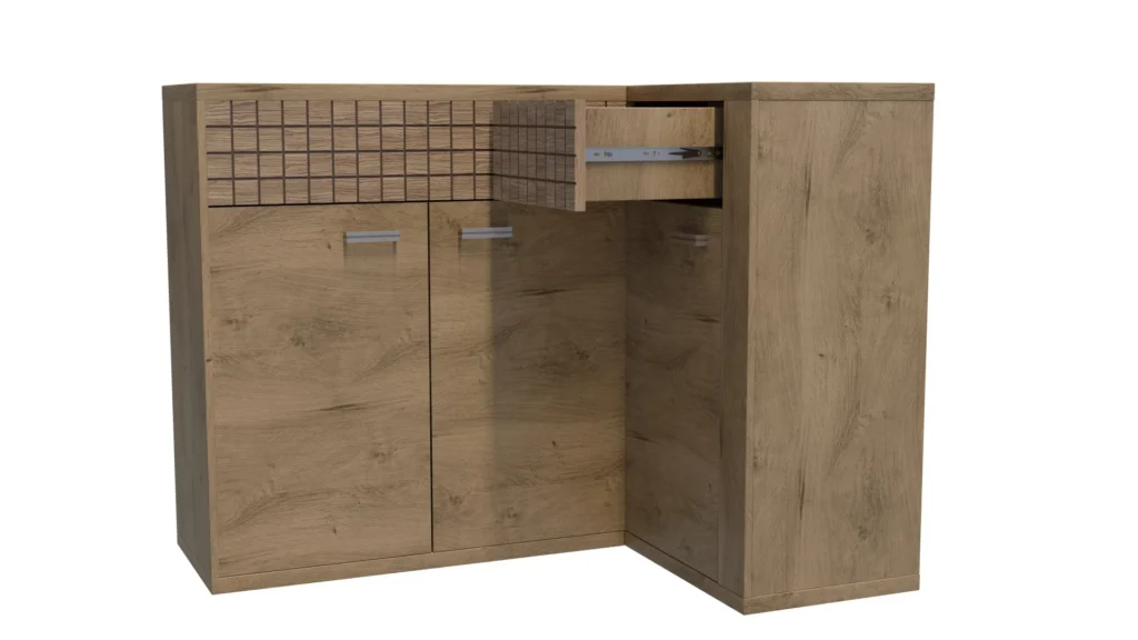 Wygodna komoda narożna z kolekcji Natural, która świetnie wpasuje się w każde pomieszczenie. Solidnie zrobiona z płyty laminowanej, pasować będzie w każdej kompozycji, a jeszcze więcej da się z nią stworzyć. Posiada trzy szafki, z czego dwie są połączone ze sobą i mają jedną wspólną półkę, trzecia szafka też ma półkę, która dzieli przestrzeń na pół. Powyżej szafek znajdują się dwie szuflady z systemem Push To Open, który podkreśla delikatność mebla. Dzięki tej komodzie organizacja to przyjemność. Metalowe uchwyty, jak i cichy domyk szafek pokazują, że zadbano w niej o każdy detal.