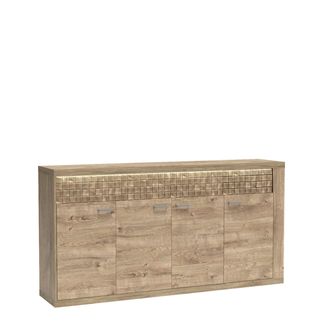 Duża komoda z czterema szafkami. W środku pojemne dwie półki a wyżej szuflady z systemem Push To Open. Mebel pomieści wiele ubrań, akcesoriów i dokumentów. Będzie pasować do salonu, biura, przedpokoju czy gabinetu. Przyciągnie uwagę nie jednego gościa. Komoda została wykonana z solidnego materiału, co czyni ją wytrzymałą i gwarantuje wiele dobrych i miłych lat użytkowania mebla. Metalowe uchwyty i cichy domyk podkreślają delikatność i pokazują dbałość w najmniejsze detale.