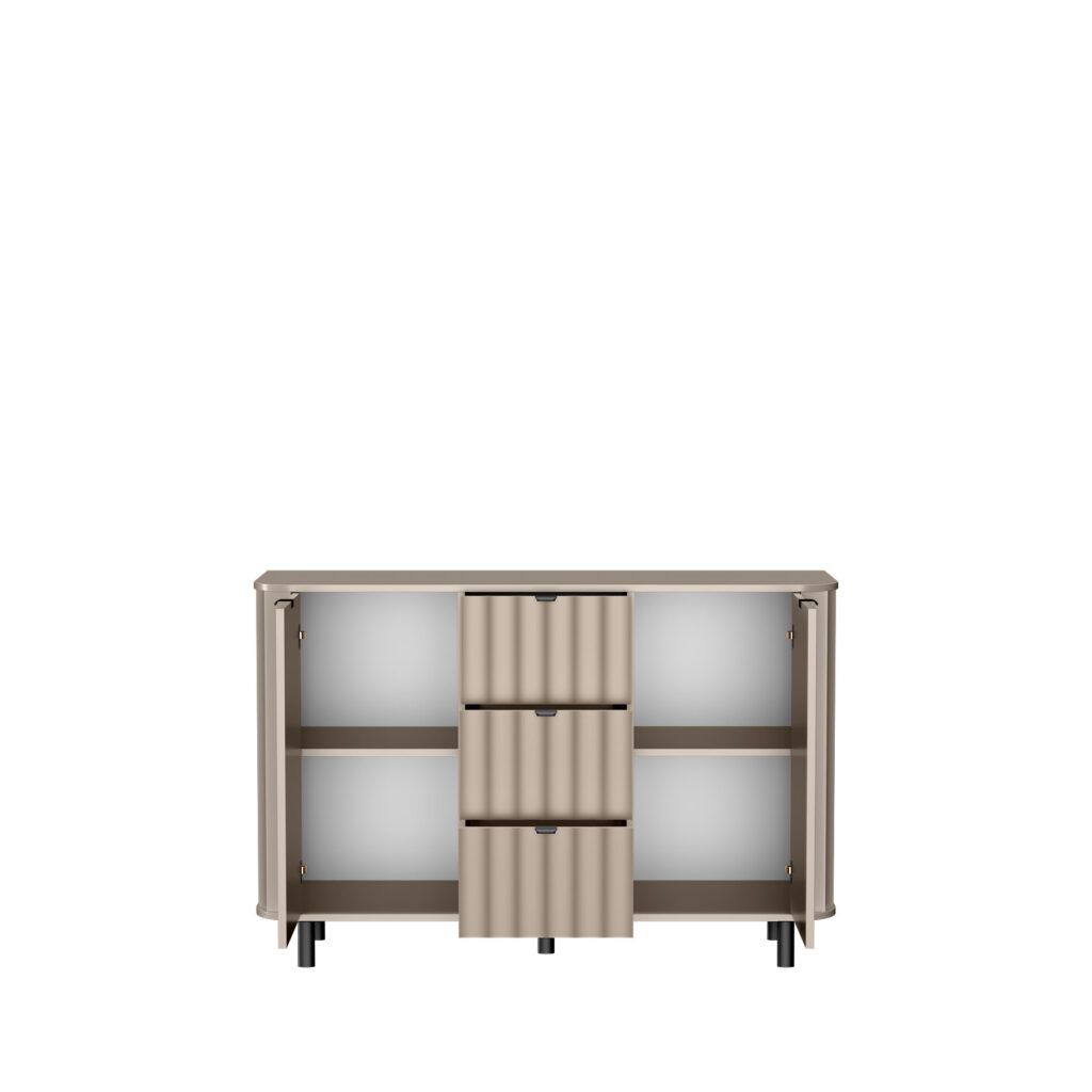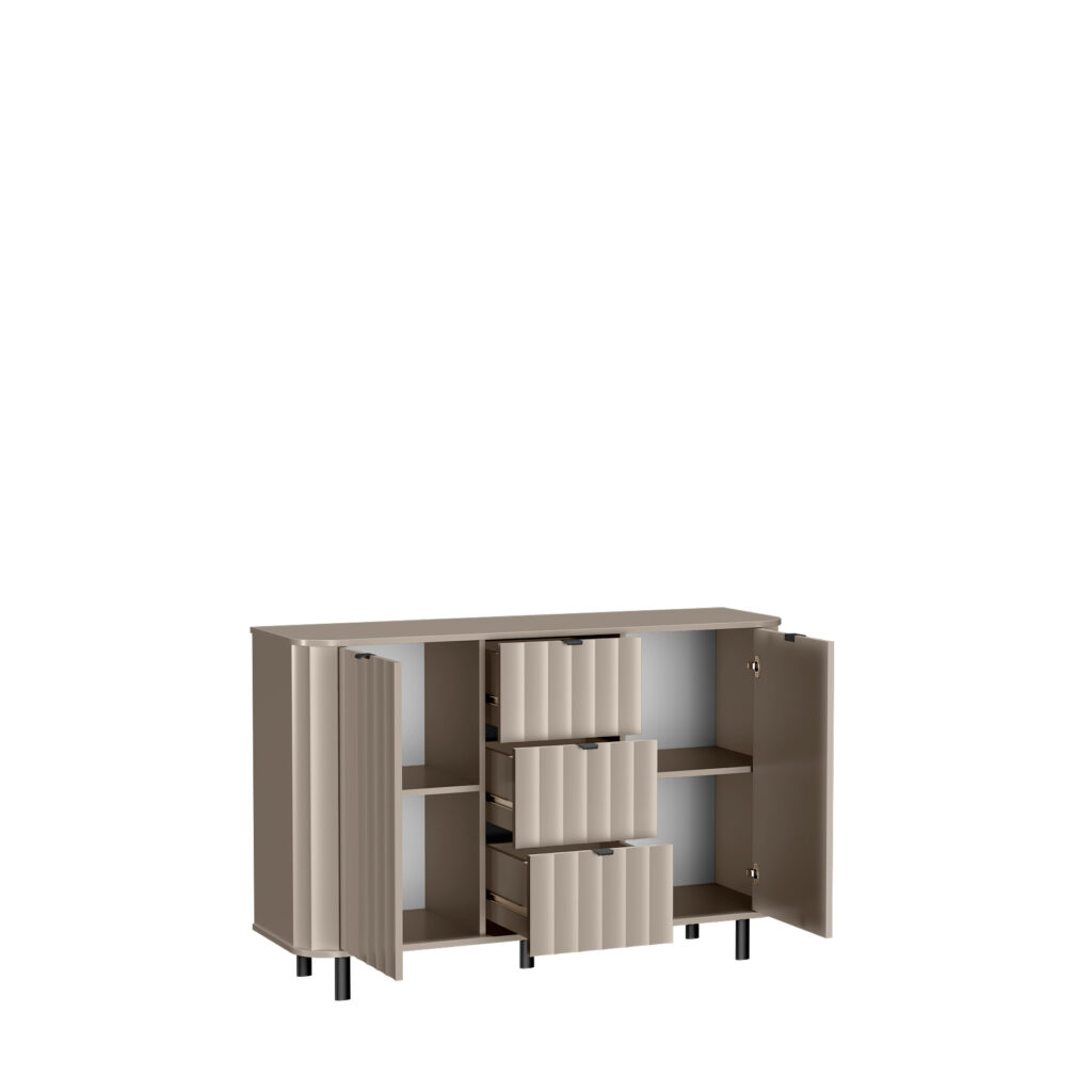 Komoda NOVADO – 1 to doskonałe połączenie elegancji i funkcjonalności, które sprawdzi się w nowoczesnych wnętrzach. Dzięki symetrycznej budowie – z trzema pojemnymi szufladami w środkowej części oraz dwoma szafkami z półkami po bokach – zapewnia wygodne przechowywanie różnorodnych przedmiotów. Idealna do salonu i sypialni.