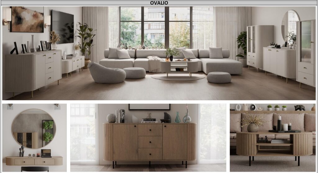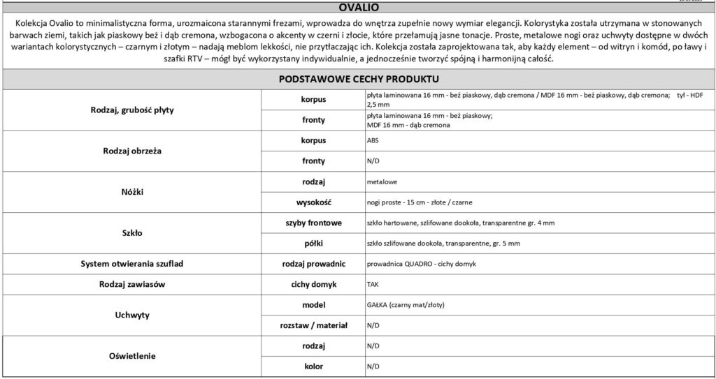 Kolekcja Ovalio to minimalistyczna forma,urozmaicona starannymi frezami,która wprowadza do wnętrza zupełnie nowy wymiar elegancji.Kolorystyka została utrzymana w stonowanych barwach ziemi,takich jak Beż Piaskowy oraz Dąb Cremona.Kolekcja została wzbogacona o akcenty w czerni i złocie,które przełamują jasne tonacje.