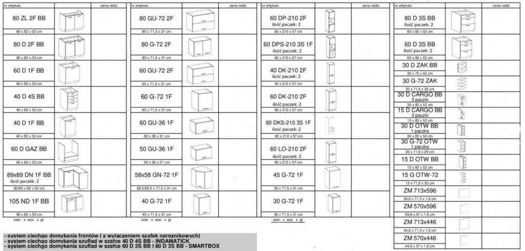 Tabela w galerii zdjęć przedstawia dostępne szafki oraz ich wymiary.