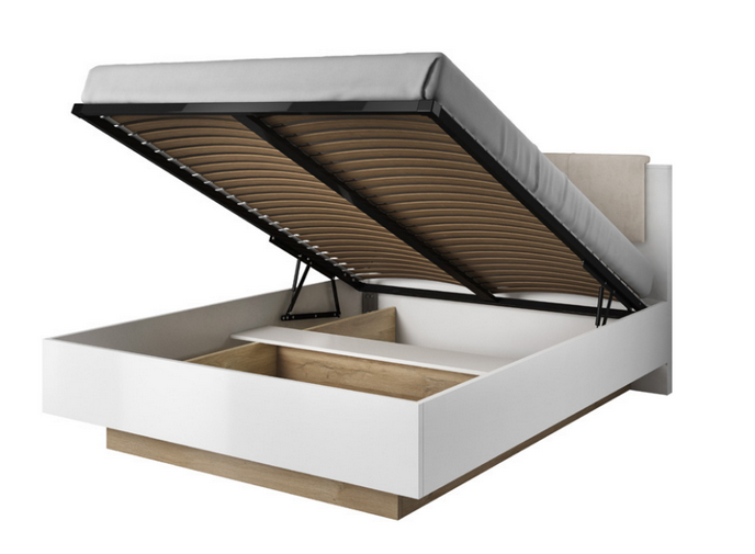 Łóżko Arco z tapicerowanym zagłowiem – Biały / Biały Połysk / Dąb Grandson – Laski