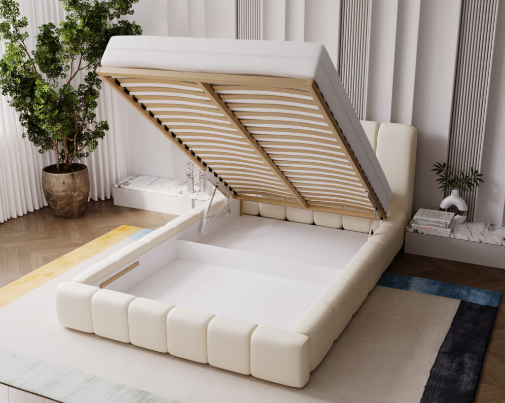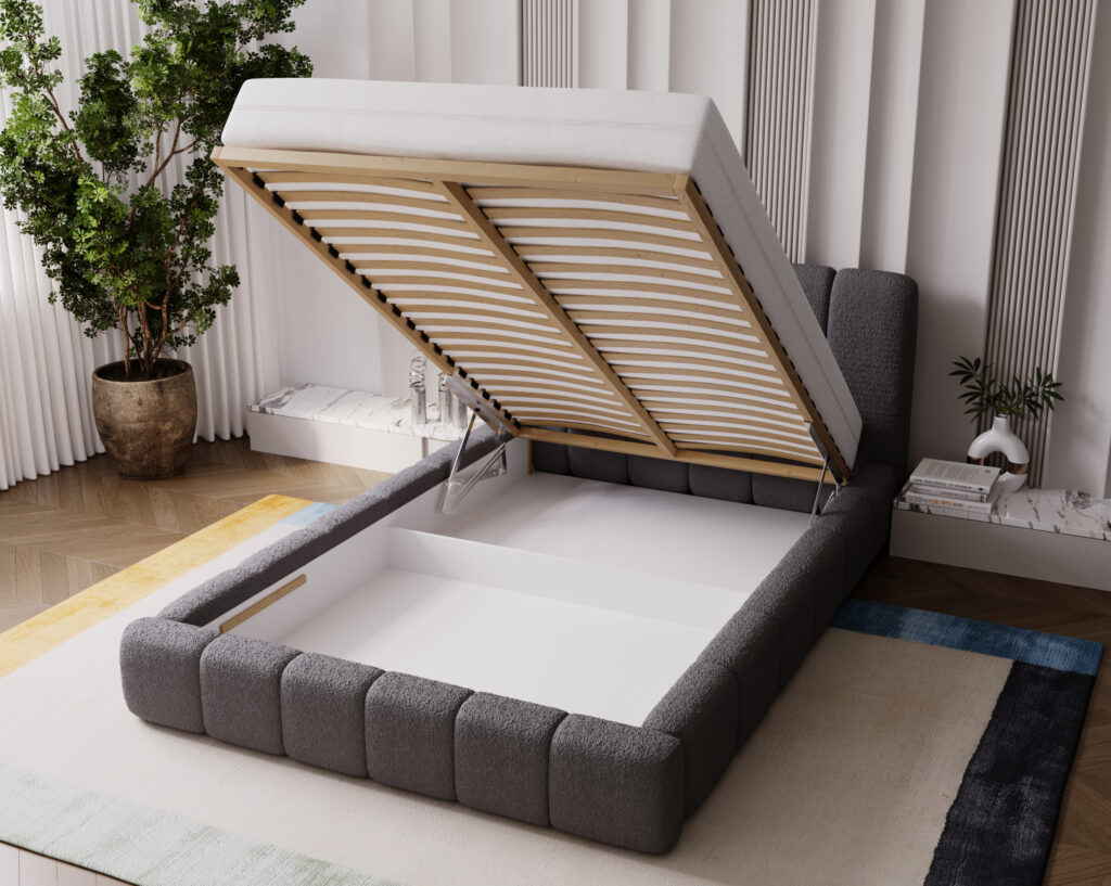 Łóżko w zestawie posiada pojemnik i stelaż pod materac.