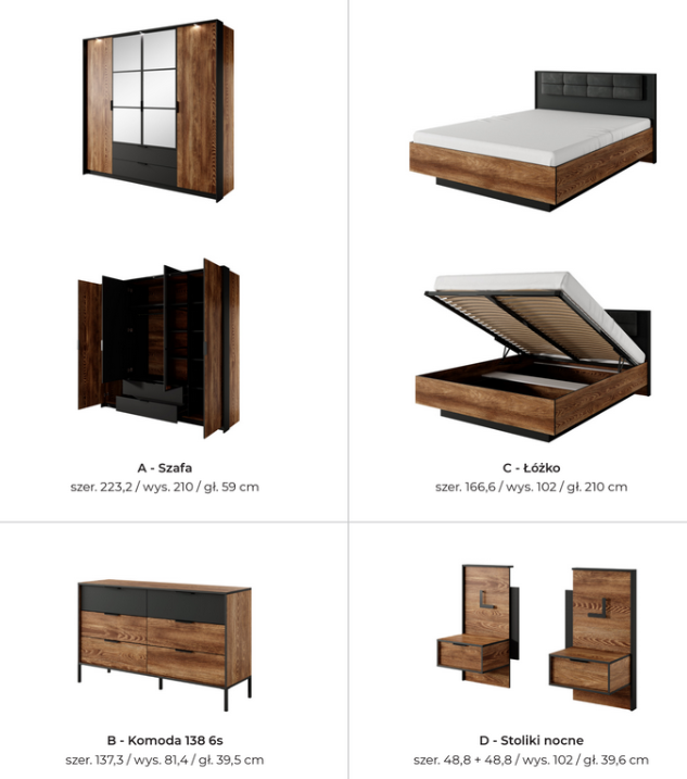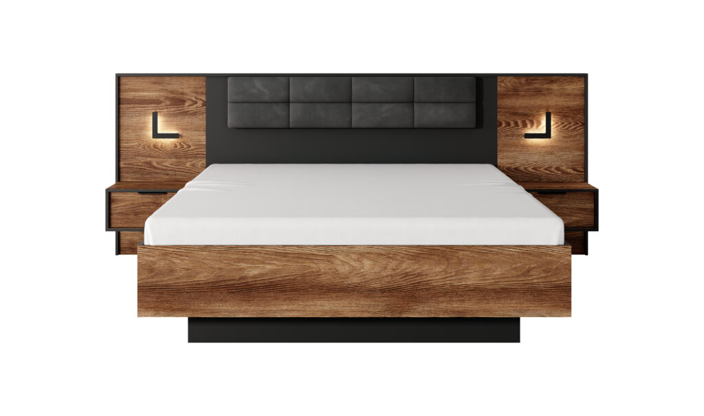 Oryginalne, stylowe i z charakterem – tak można określić meble z kolekcji MILTON. Meble, które zdecydowanie będą wspaniałą ozdobą sypialni. Harmonia pięknych dekorów: antracytu i kasztanu. Szafa, wyposażona w lustra, praktyczne szuflady i oświetlenie, komoda z pojemnymi szufladami oraz niezwykle wygodne łóżko z częściowo tapicerowanym wezgłowiem z przeszyciami oraz ciekawym oświetleniem, a wszystko w niezwykłej, głębokiej kolorystyce, tworzą idealny zestaw w loftowym stylu.