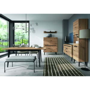 Niecodzienne połączenie połysku z dębowym dekorem i wysoką nogą o kształcie nawiązującym do formy frontów zaskoczy twoje wnętrze. Mnogość elementów w kolekcji sprawi, że nigdy nie zabraknie pomysłu na ciekawe aranżacje. Subtelny charakter formy