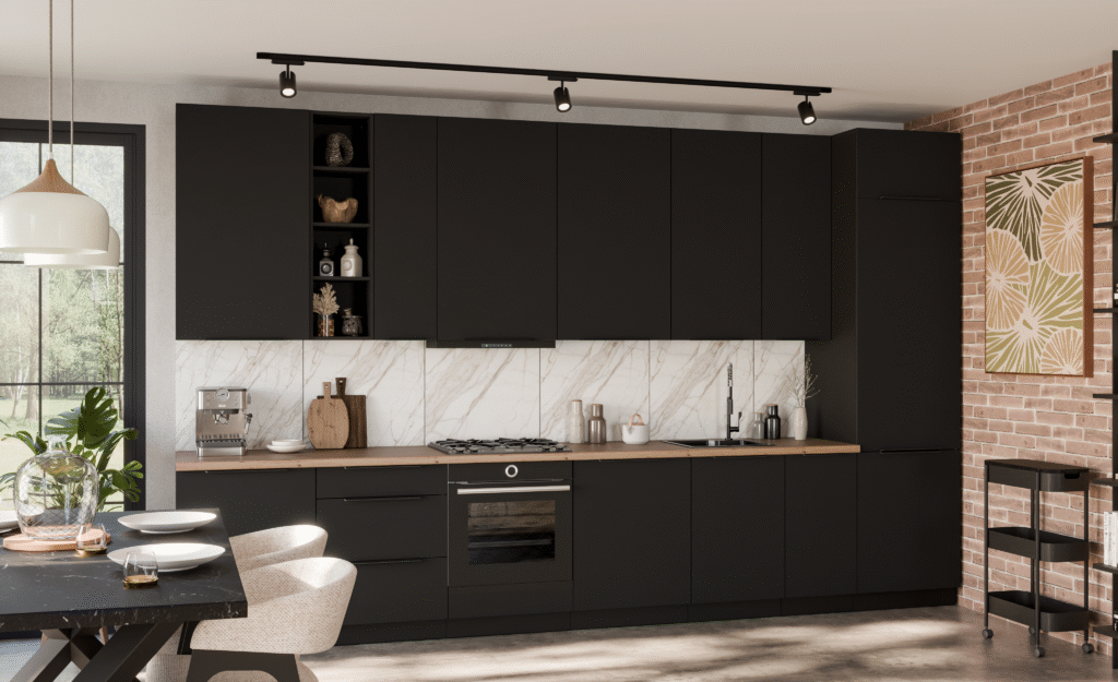 Przedmiotem oferty jest zestaw mebli kuchennych Aria w kolorze czarne / czarne – ze zdjęcia głównego.