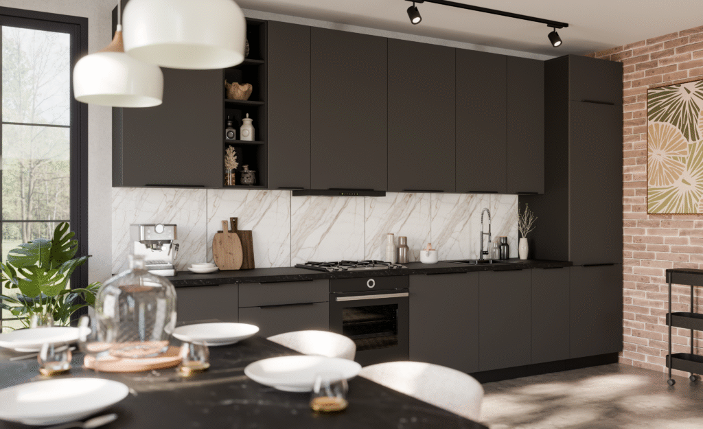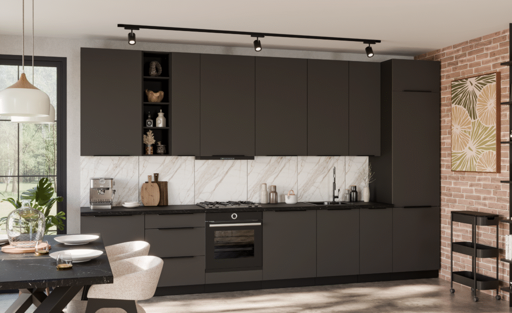 Przedmiotem oferty jest zestaw mebli kuchennych Aria w kolorze grafit / czarne – ze zdjęcia głównego.
