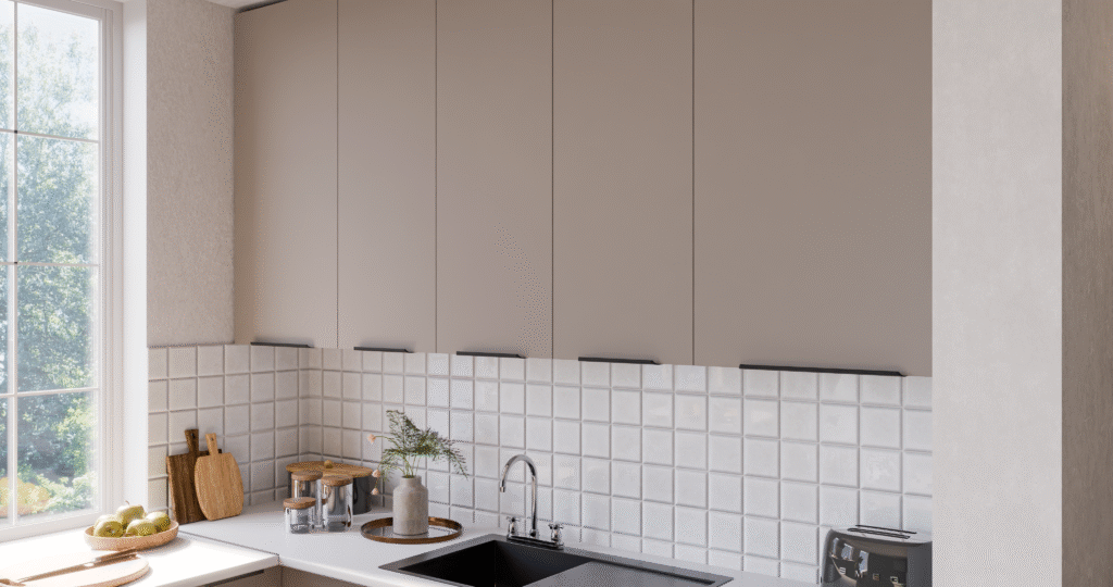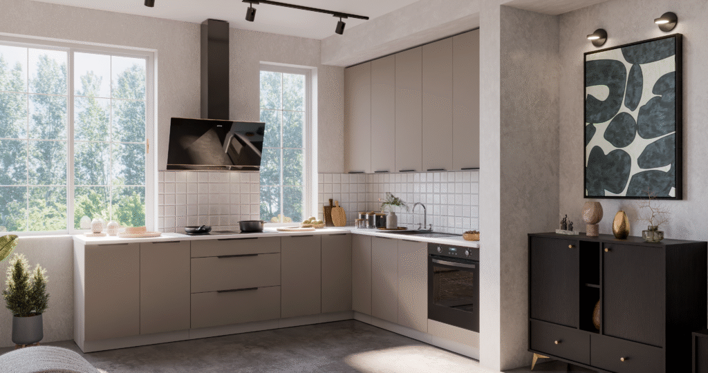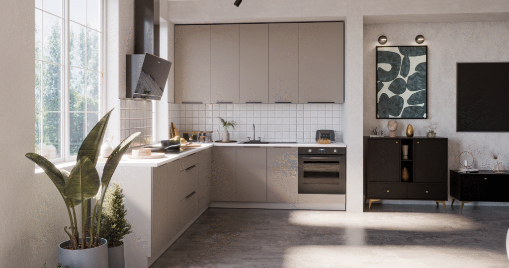 Przedmiotem oferty jest zestaw mebli kuchennych Aria w kolorze sandgrau / białe – ze zdjęcia głównego.