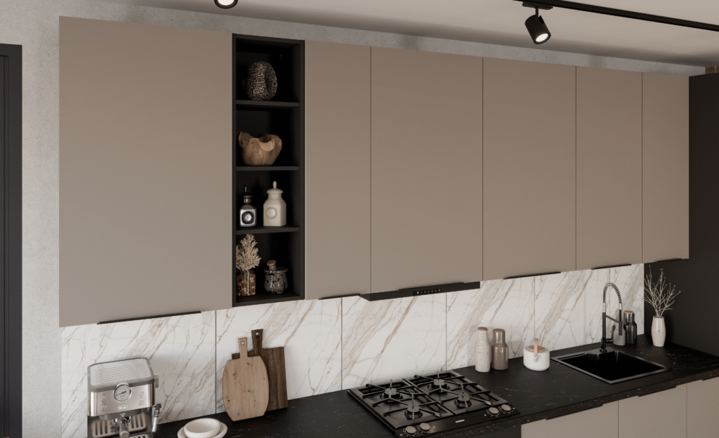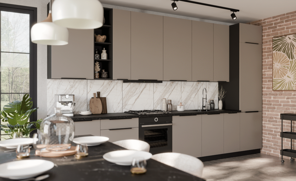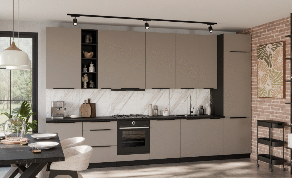 Przedmiotem oferty jest zestaw mebli kuchennych Aria w kolorze sandgrau / czarne – ze zdjęcia głównego.