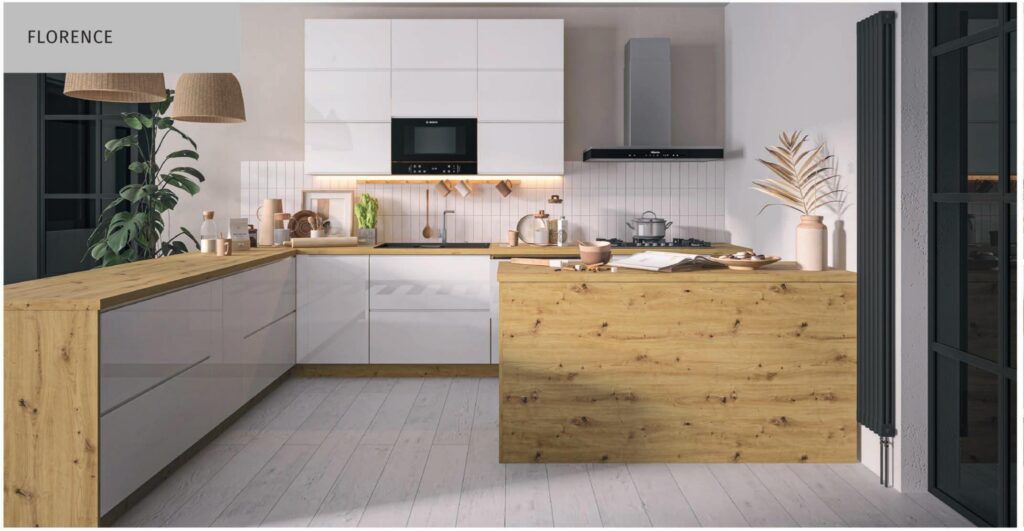 Meble Kuchenne Carrini – Akryl Biały Połysk/Hikora Naturalna 19 mm – Extom