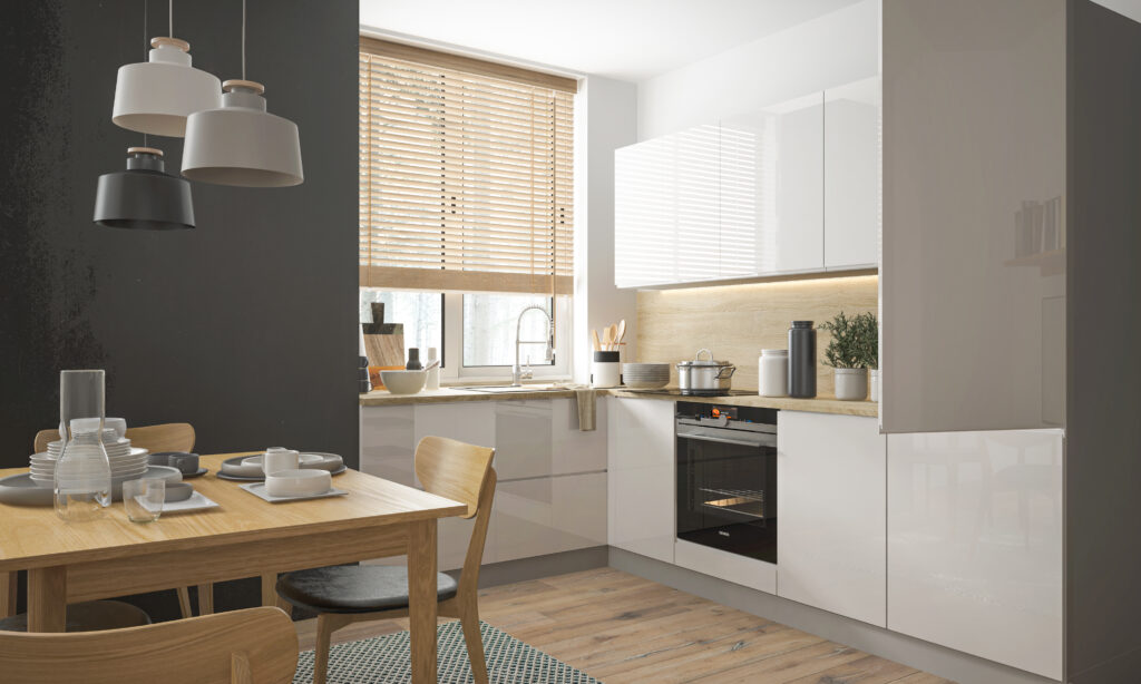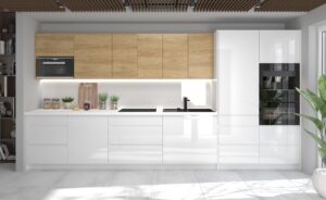 Przedmiotem oferty jest zestaw mebli kuchennych z kolekcji Carrini Akryl w kolorze Biały Połysk oraz Hikora Naturalna.