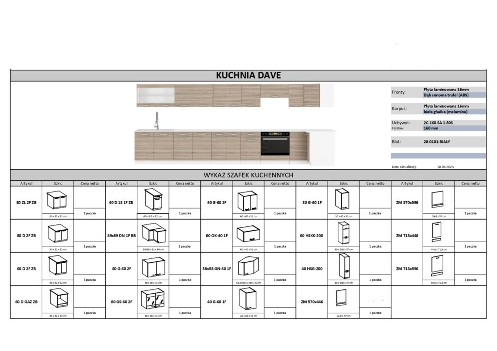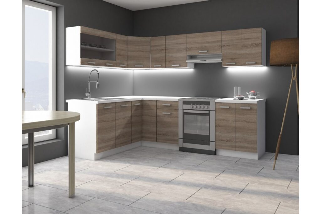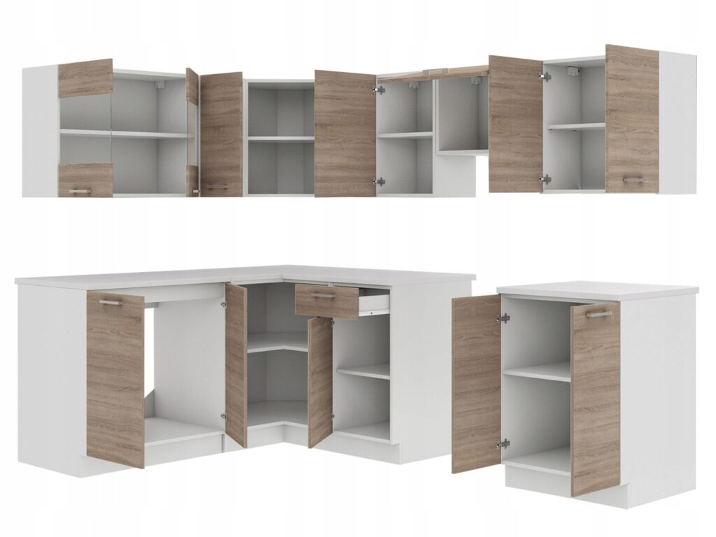 Nowoczesne meble kuchenne wykonane z wysokiej jakości materiałów odpowiednich do zastosowania w kuchni. Zestaw mebli kuchennych wykonany jest z wysokogatunkowej płyty laminowanej z obrzeżami ABS o zwiększonej odporności na zarysowania, wilgoć oraz temperaturę. Uchwyty w zestawie wykonane są z wytrzymałego tworzywa.Szafki kuchenne są bardzo pojemne i funkcjonalne i otwieranie. Fronty szafek są uniwersalne. Producent zastosował system otwierania uchwytowy ( brak funkcji cichego domyku ), zawiasy są zwykłe puszkowe, a szuflady są na prowadnicach rolkowych.