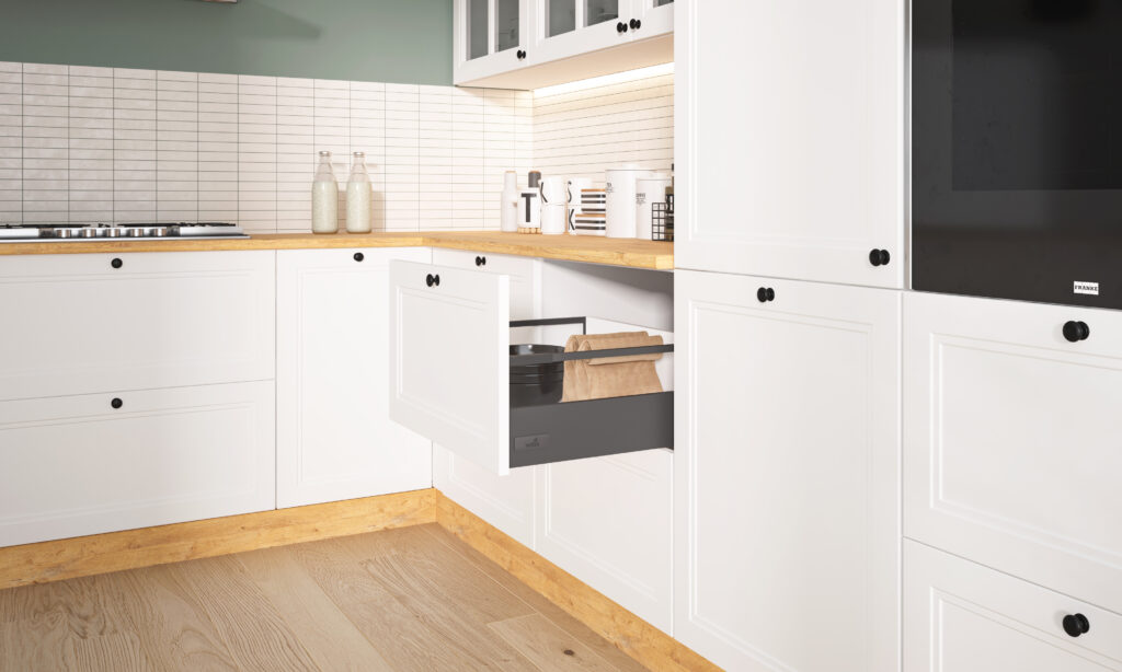 Szuflady w standardzie wyposażone są w wysokiej jakości prowadnice Comfort Box R :