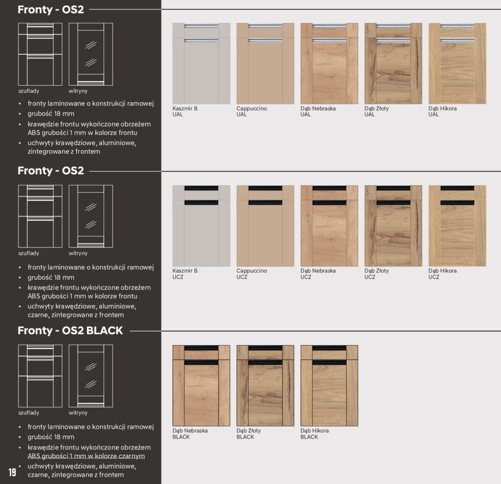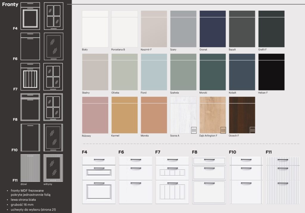 Fronty typu F frezowane MDF matowe o grubości 16 mm.Fronty od lewej strony są białe.