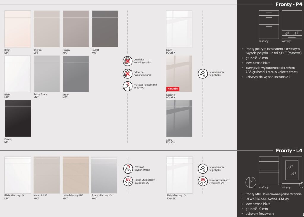 Prosta, matowa forma frontów nada wnętrzu elegancji i wyrafinowania.Fronty te są aksamitne w dotyku.Krawędzie mają zabezpieczone obrzeżem ABS co zapewnia dodatkową ochronę i estetyczne wykonanie.