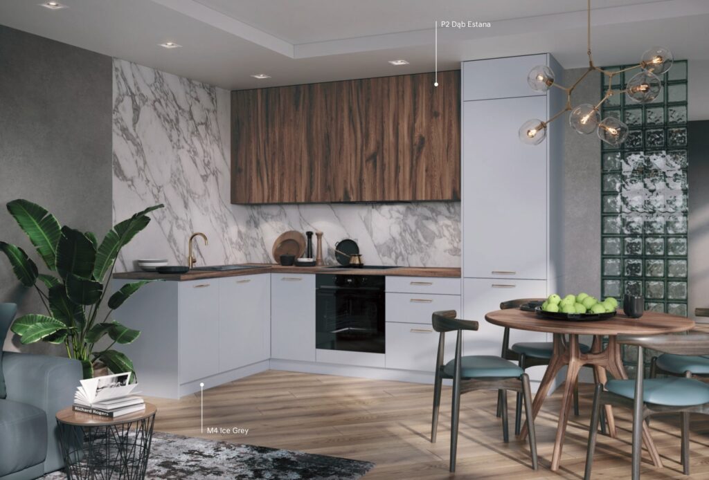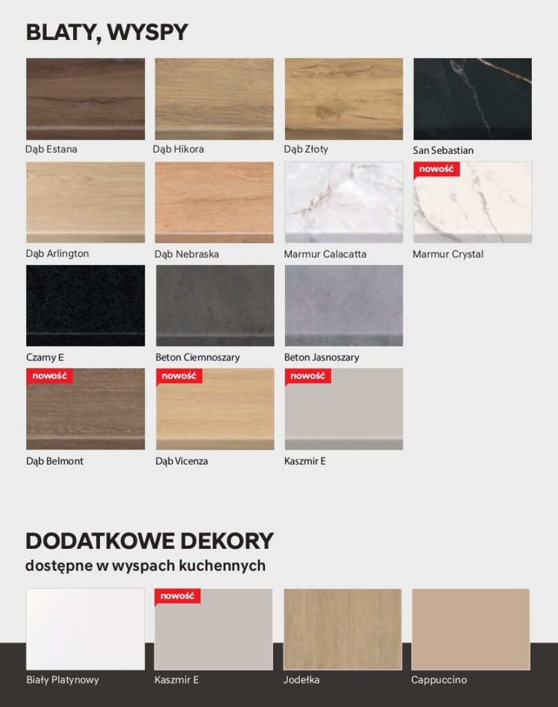 W galerii zdjęć są również wzornik blatów do wyboru.Od jasnych bieli przez beże i szarości do pięknych dekorów w kolorze drewna lub kamienia naturalnego.