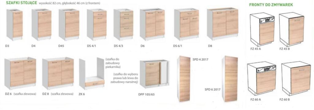 – Szafki dolne – wysokość 82 cm, głębokość 46 cm (z frontem)