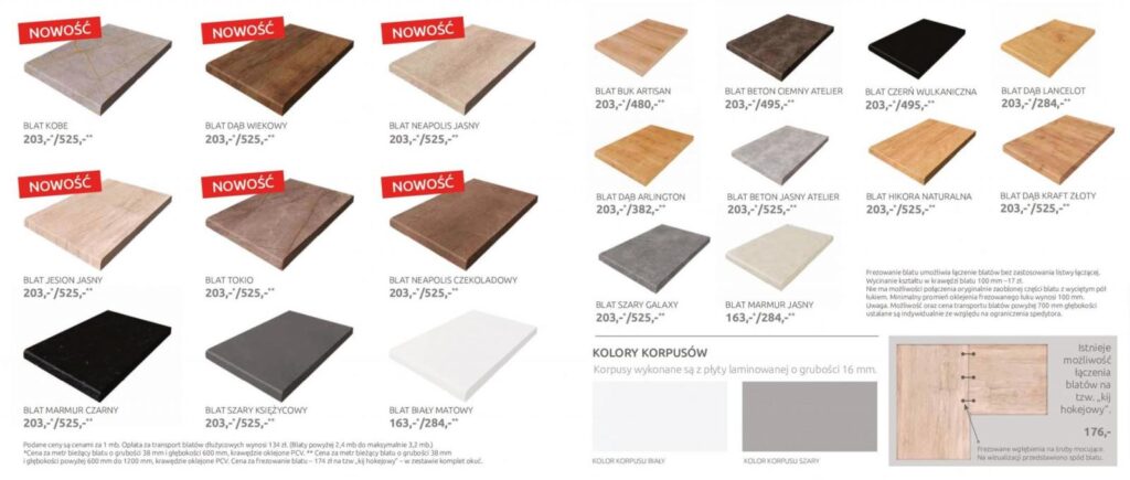Do zestawu opcjonalnie można wybrać blaty kuchenne o grubości 38 mm w wielu ciekawych wybarwieniach.Dostępne blaty są najwyższej jakości wykonane w technologii Duropal oraz Termopal.