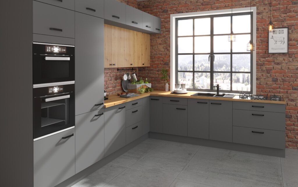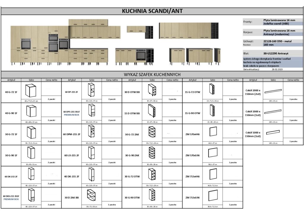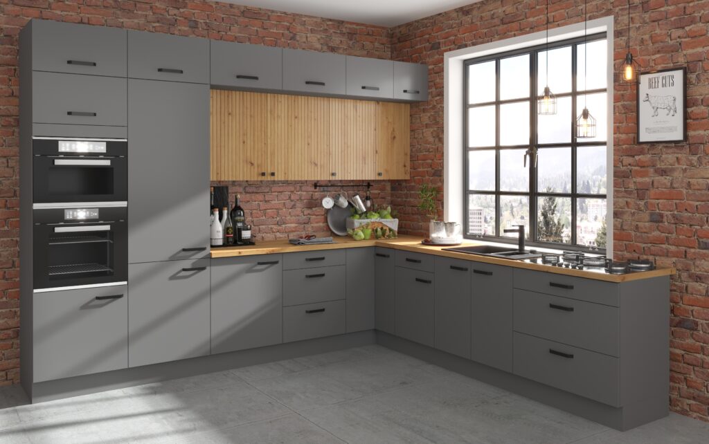 Przedmiotem oferty jest zestaw mebli kuchennych w stylu skandynawskim z kolekcji Nessa w kolorze Antracyt Mat oraz Scandi w kolorze Jodełka i blatem w kolorze Antracyt Mat widoczny na zdjęciu w galerii.