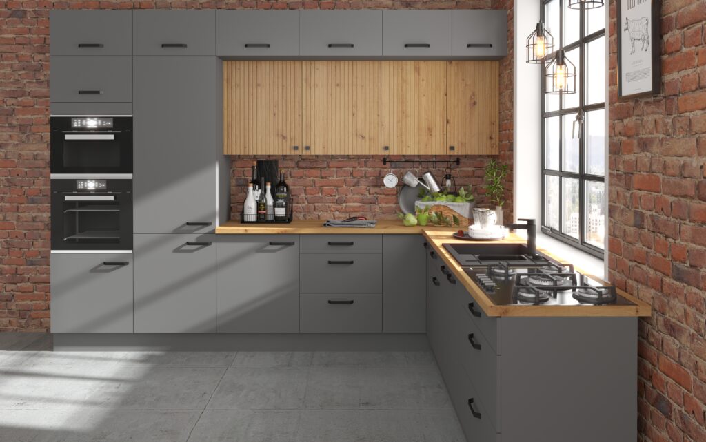 Przedmiotem oferty jest zestaw mebli kuchennych w stylu skandynawskim z kolekcji Nessa w kolorze Antracyt Mat oraz Scandi w kolorze Jodełka i blatem w kolorze Flame Wood widoczny na zdjęciu w galerii.