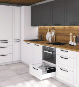 Funkcjonalne szuflady z wkładami dopasowanymi do ich rodzaju, oraz pojemne szafki w olbrzymiej gamie szerokości i wysokości pozwolą na stworzenie kuchni praktycznej, dopasowanej do Twoich potrzeb.