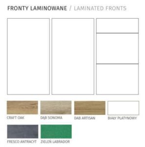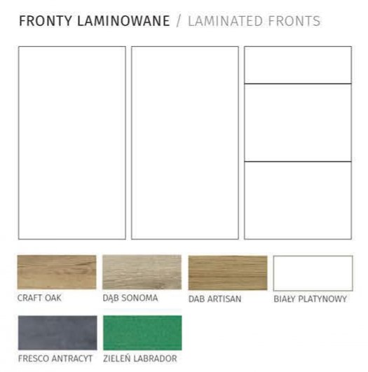 • Fronty – laminowane o grubości 16 mm ( dekory drewna ) oraz 18 mm ( jednolite kolory )
