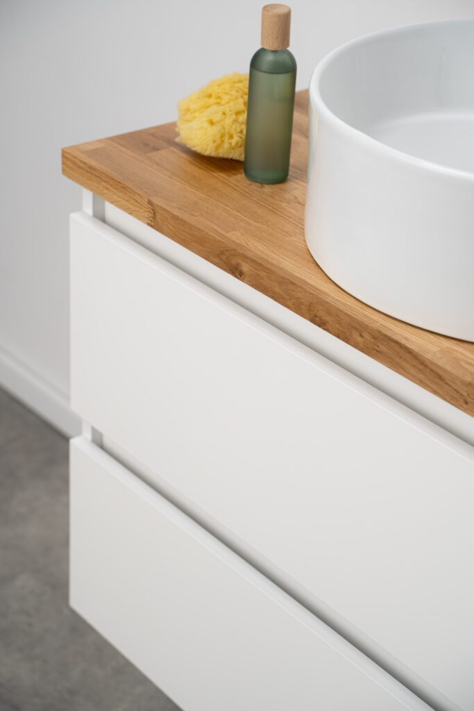 Akcesoria – szuflady wyposażone w prowadnice Hettich Quadro z cichym domykiem; drewniany organizer / osłona syfonu; zawieszki Hettich z regulacją