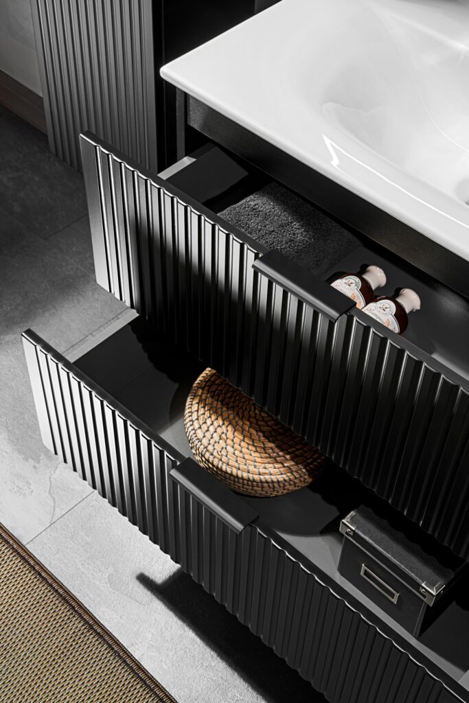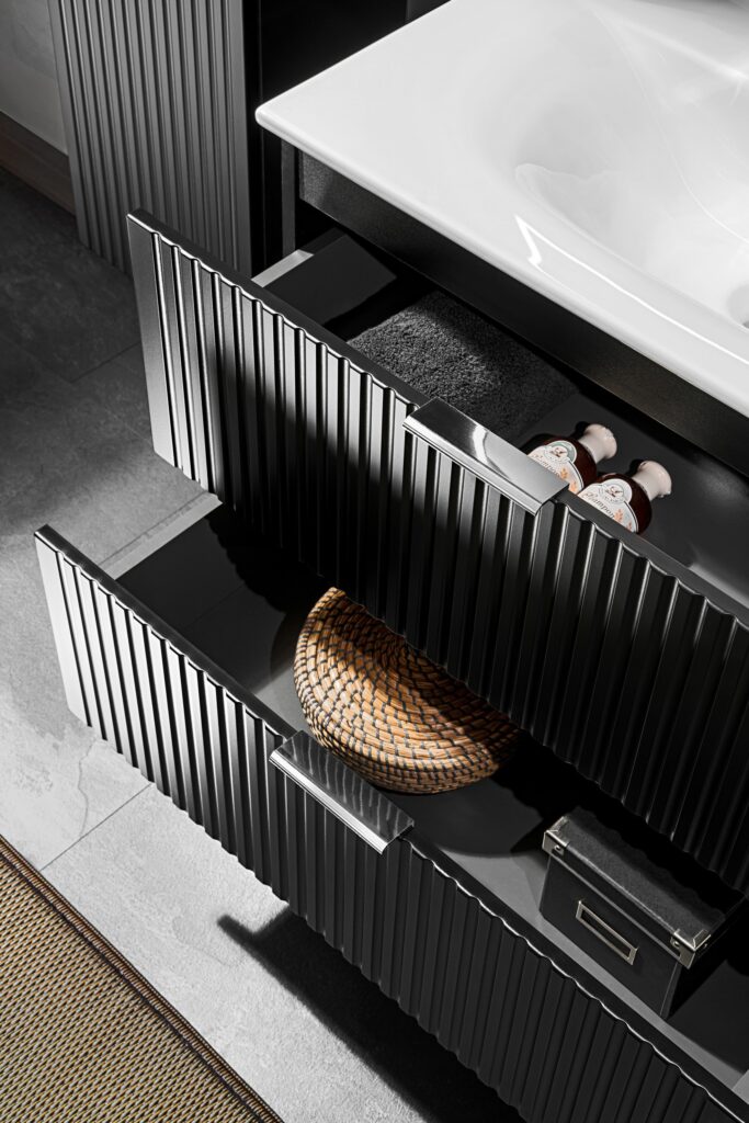 Każda szafka zawiera trzy opcje kolorystyczne uchwytów: złoty połysk, chrom połysk oraz czarny mat, pozwalając na dalszą personalizację i dopasowanie mebli do preferencji stylistycznych. Umożliwia to dopasowanie koloru uchwytów do pozostałych elementów łazienki, takich jak armatura czy lustra, co pozwala na stworzenie spójnej i harmonijnej przestrzeni.