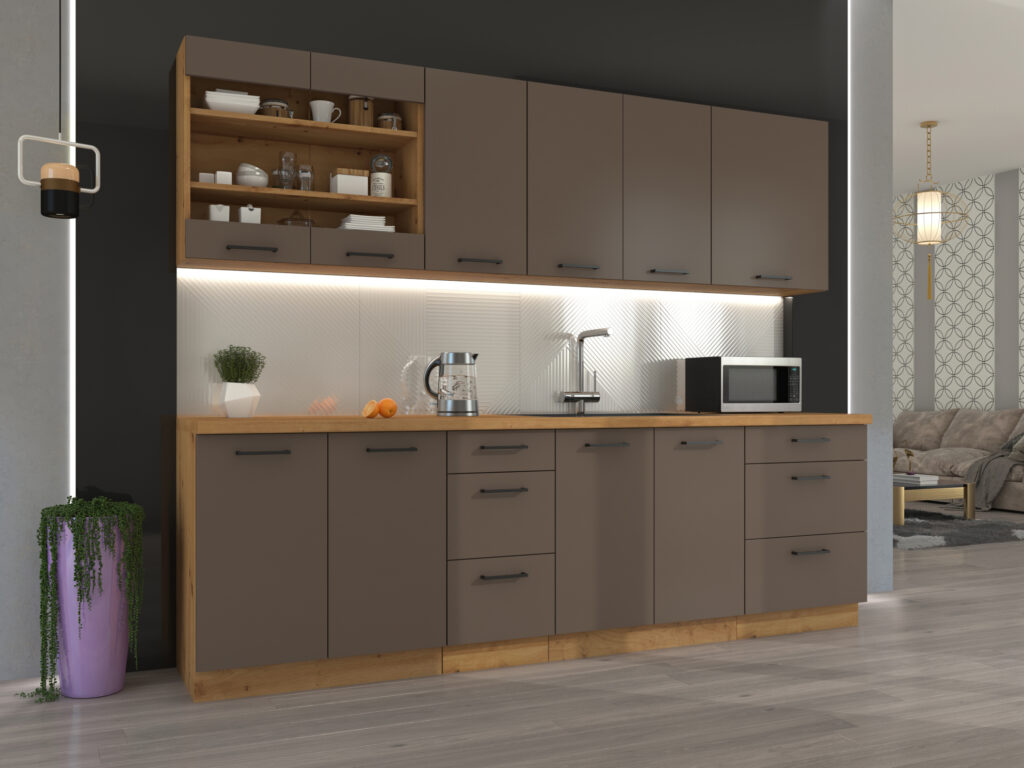 W cenę zestawu wliczony został blat Dąb Artisan widoczny na zdjęciu o grubości 38 mm w odcinku 260 cm na 60 cm