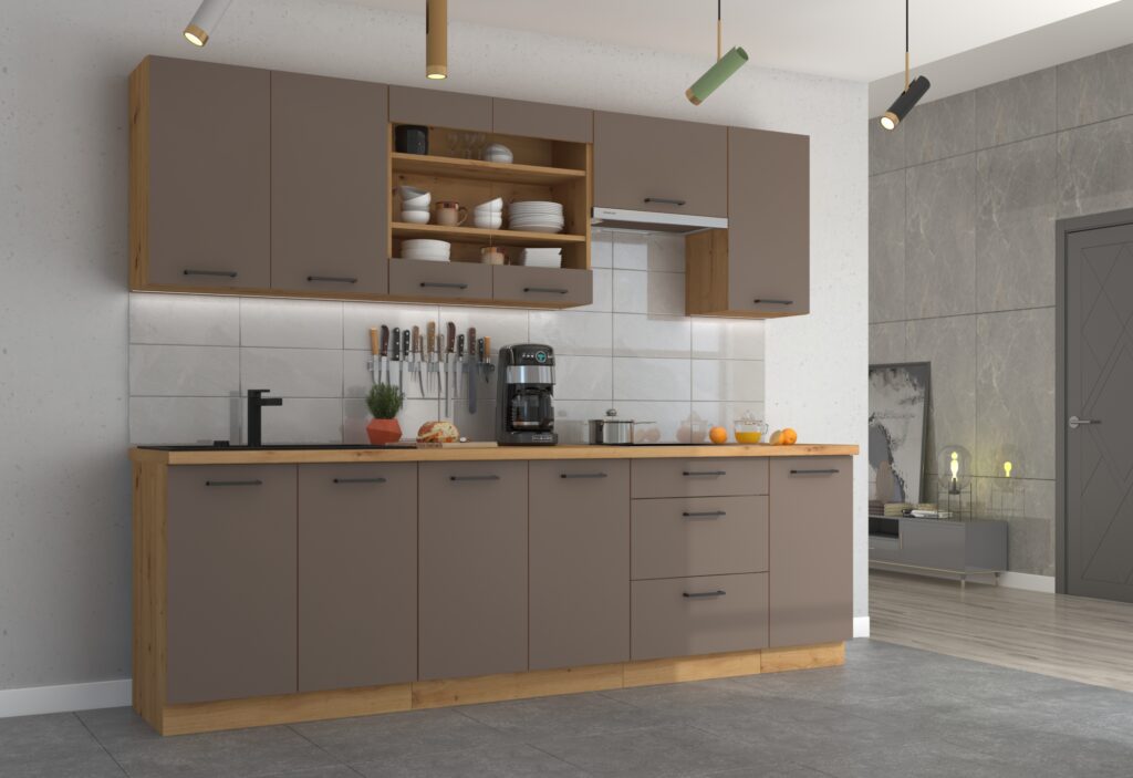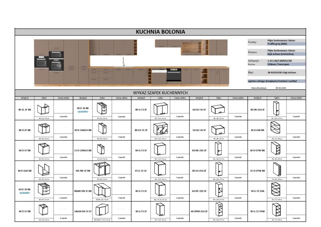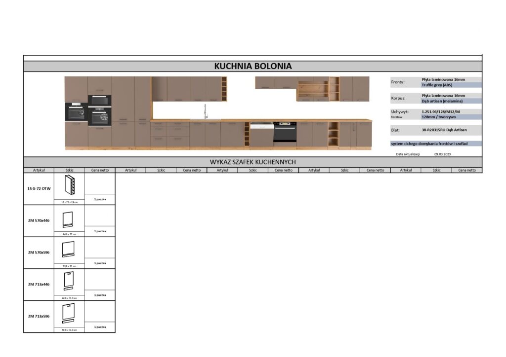Przedmiotem oferty jest zestaw mebli kuchennych w stylu skandynawskim z kolekcji Bolonia w kolorze Trufel Grey/Dąb Artisan wraz z blatem Dąb Artisan widoczny na zdjęciu głównym w galerii.