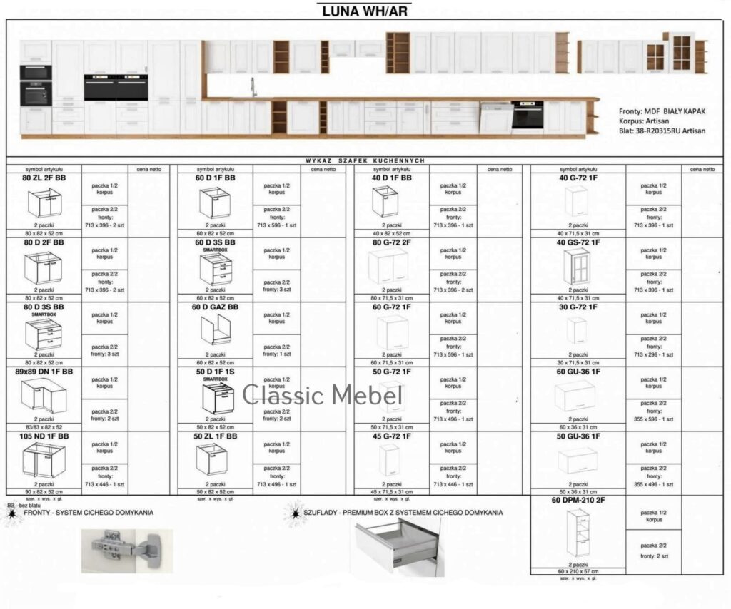 Przedmiotem oferty jest zestaw mebli kuchennych w stylu skandynawskim z kolekcji Luna w kolorze Biała Ramka oraz Dąb Artisan widoczny na zdjęciu głównym w galerii.