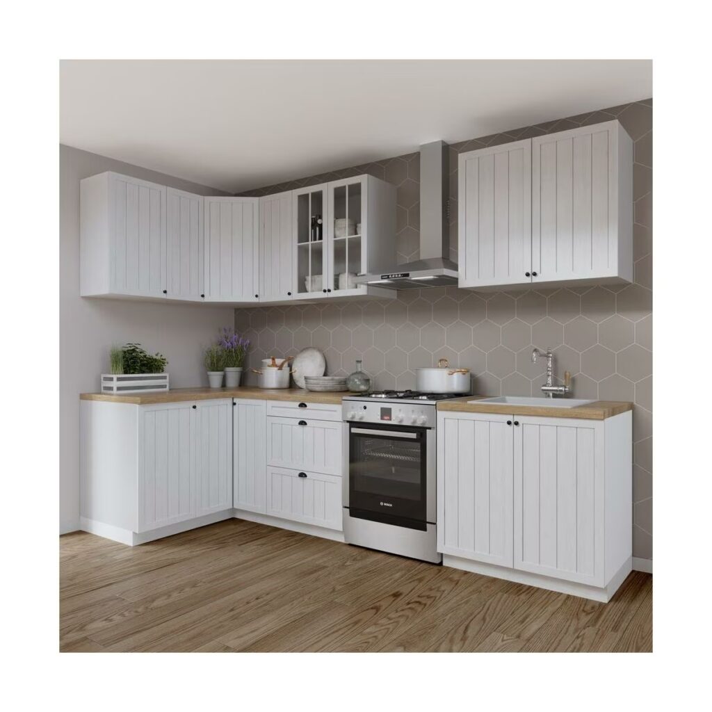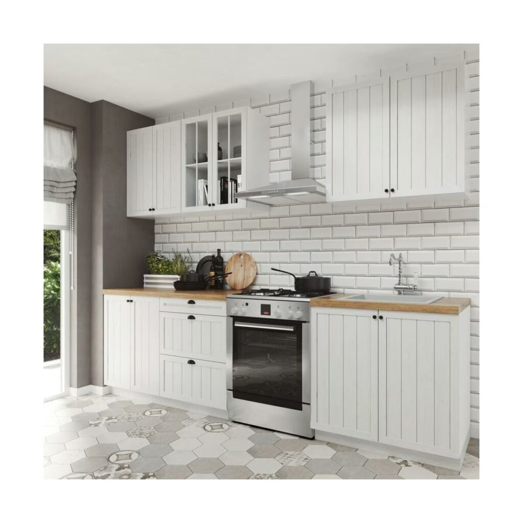 Nowoczesny i zarazem elegancki zestaw mebli kuchennych z frontami w białym połysku oraz dodatkiem koloru Dąb Lancelot.