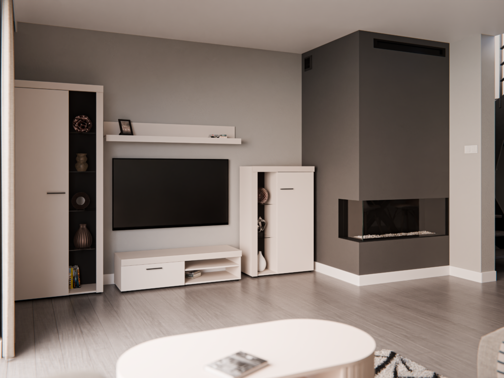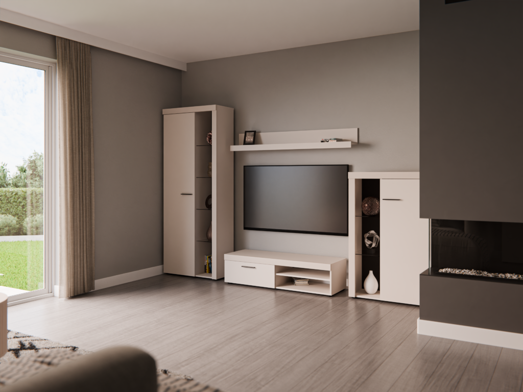 Nowoczesna meblościanka z miejscem na telewizor nadająca się do każdego wnętrza. Nadaje się do salonu. Meblościanka zachwyci swoim wyglądem oraz funkcjonalnością. Zestaw wykonany jest z grubej płyty laminowanej z wzmocnionymi obrzeżami ABS, listwy natomiast wykonane są z płyty MDF. Zestaw jest bardzo odporny na wilgoć oraz zabrudzenia. Zestaw posiada uchwyty wykonane z tworzywa sztucznego. W skład zestawu wchodzą: witryna stojąca duża, szafka RTV, półka wisząca, witryna stojąca mała oraz komoda.
