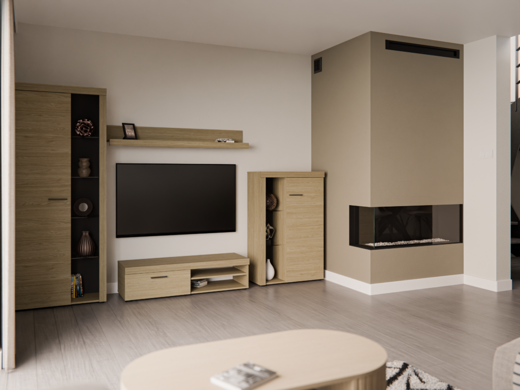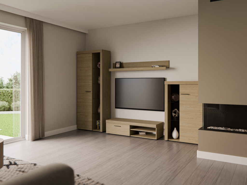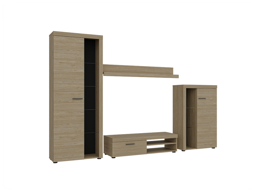 Nowoczesna meblościanka z miejscem na telewizor nadająca się do każdego wnętrza. Nadaje się do salonu. Meblościanka zachwyci swoim wyglądem oraz funkcjonalnością. Zestaw wykonany jest z grubej płyty laminowanej z wzmocnionymi obrzeżami ABS, listwy natomiast wykonane są z płyty MDF. Zestaw jest bardzo odporny na wilgoć oraz zabrudzenia. Zestaw posiada uchwyty wykonane z tworzywa sztucznego. W skład zestawu wchodzą: witryna stojąca duża, szafka RTV, półka wisząca, witryna stojąca mała oraz komoda.