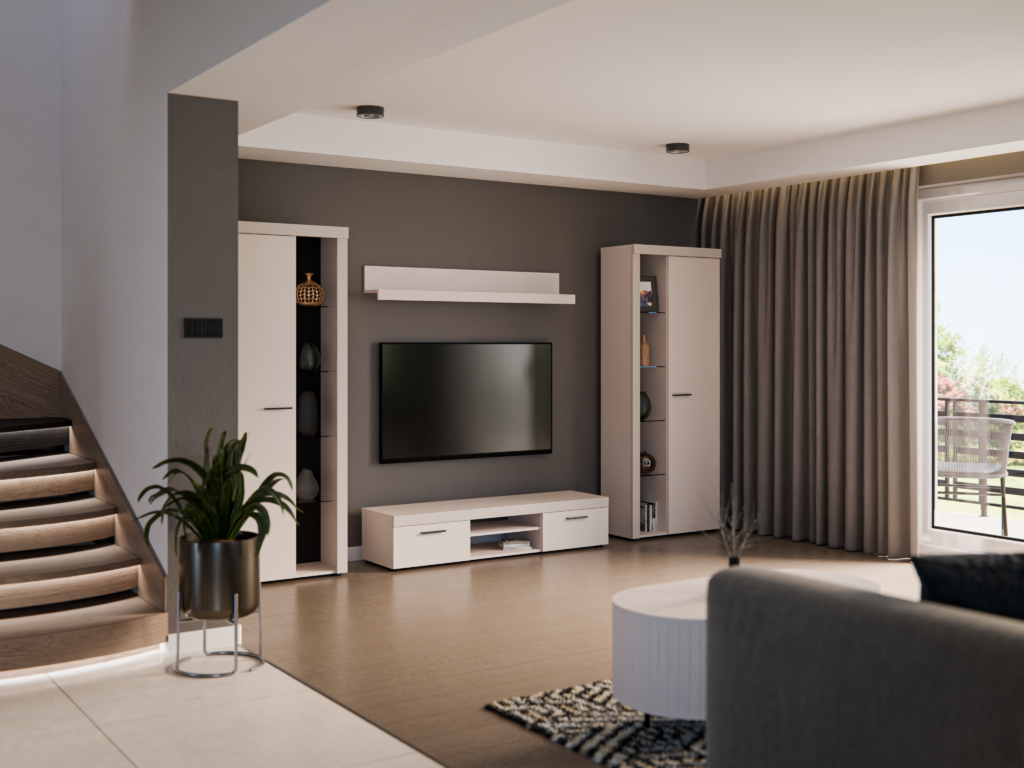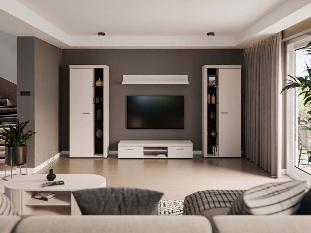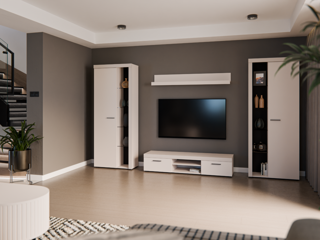 Nowoczesna meblościanka z miejscem na telewizor nadająca się do każdego wnętrza. Nadaje się do salonu. Meblościanka zachwyci swoim wyglądem oraz funkcjonalnością. Zestaw wykonany jest z płyty laminowanej z wzmocnionymi obrzeżami ABS, listwy natomiast wykonane są z płyty MDF. Zestaw jest bardzo odporny na wilgoć oraz zabrudzenia. Zestaw posiada uchwyty wykonane z tworzywa sztucznego. W skład zestawu wchodzą : witryna stojąca duża, szafka RTV, półka wisząca oraz witryna stojąca duża.