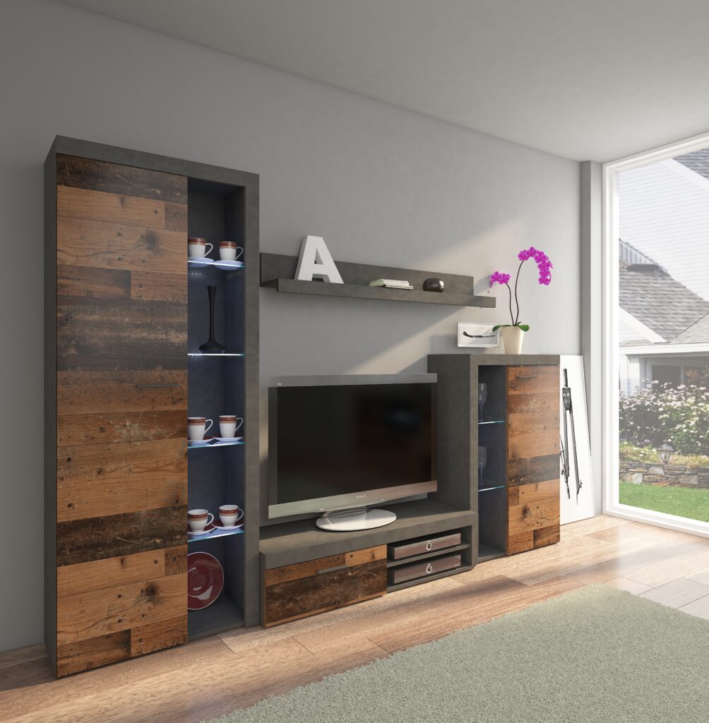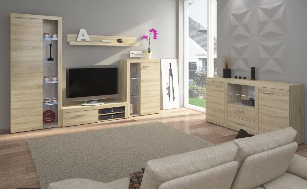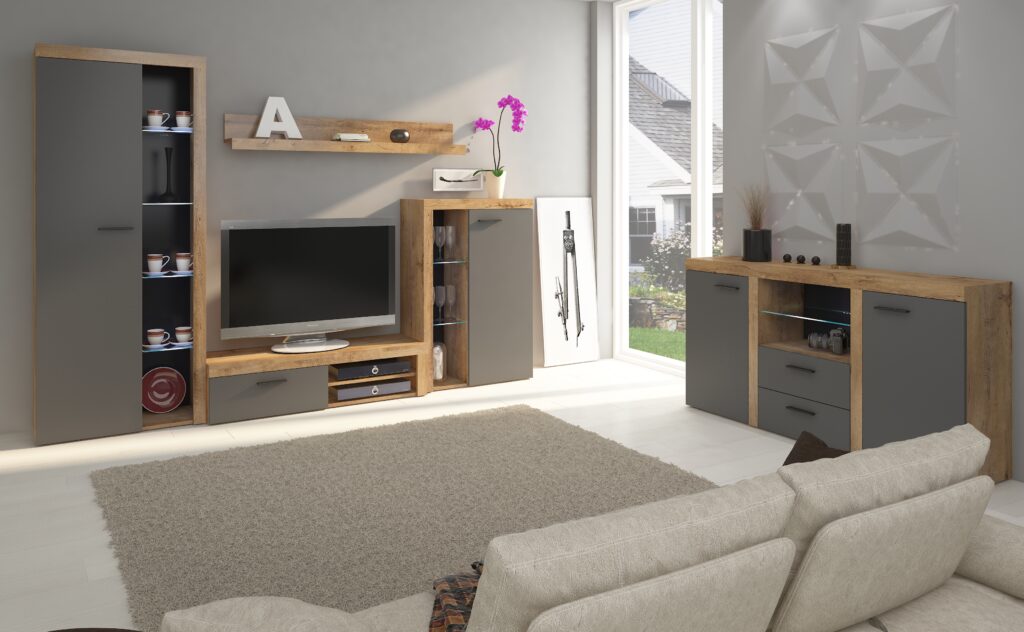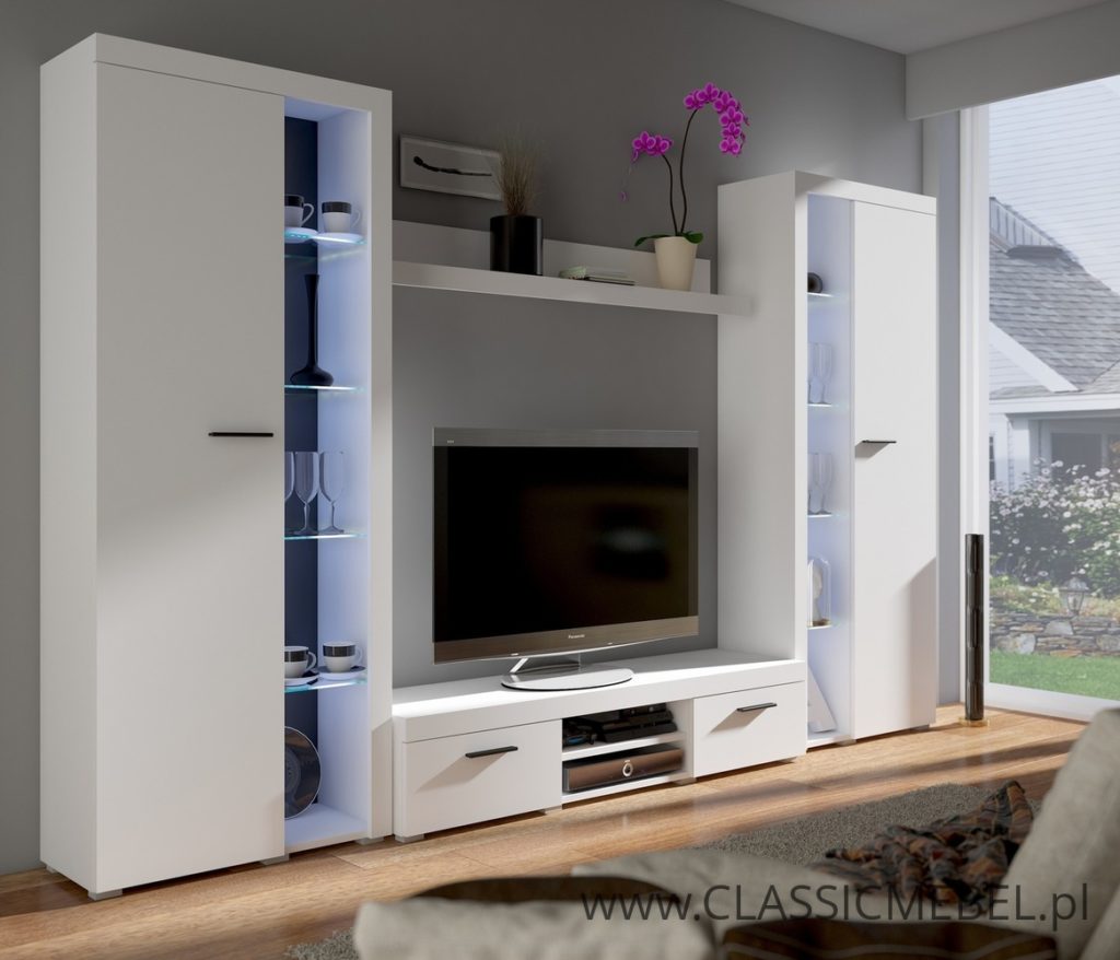 Nowoczesna meblościanka z miejscem na telewizor nadająca się do każdego wnętrza. Nadaje się do salonu. Meblościanka zachwyci swoim wyglądem oraz funkcjonalnością.