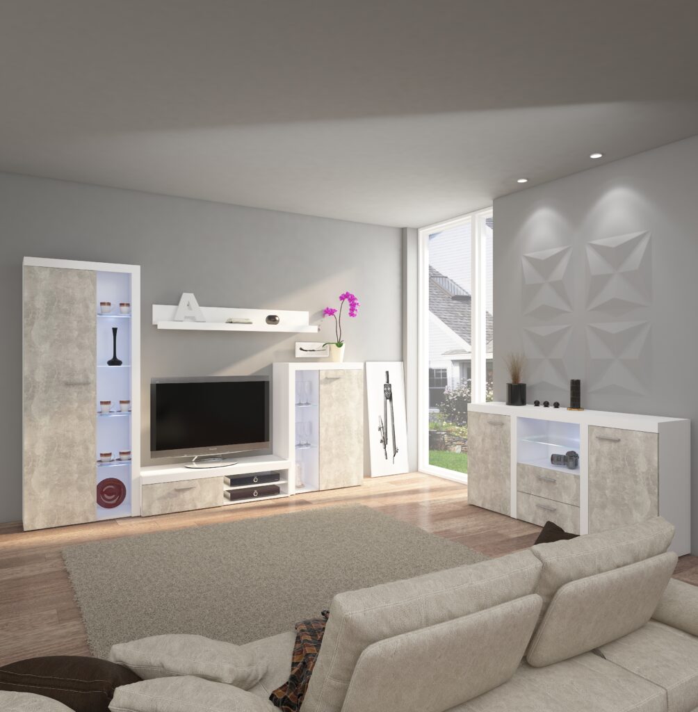 Nowoczesna meblościanka z miejscem na telewizor nadająca się do każdego wnętrza. Nadaje się do salonu. Meblościanka zachwyci swoim wyglądem oraz funkcjonalnością. Zestaw wykonany jest z płyty laminowanej z wzmocnionymi obrzeżami ABS, listwy natomiast wykonane są z płyty MDF. Zestaw jest bardzo odporny na wilgoć oraz zabrudzenia. Zestaw posiada uchwyty wykonane z tworzywa sztucznego. W skład zestawu wchodzą : witryna stojąca duża, szafka RTV, półka wisząca oraz witryna stojąca duża.