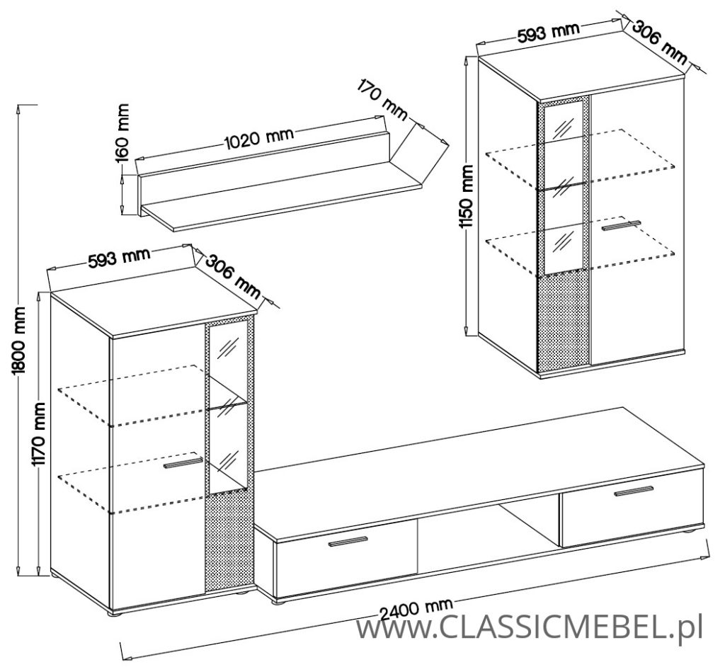 Nowoczesna meblościanka z miejscem na telewizor nadająca się do każdego wnętrza. Nadaje się do salonu. Meblościanka zachwyci swoim wyglądem oraz funkcjonalnością. Zestaw wykonany jest z grubej płyty laminowanej z wzmocnionymi obrzeżami ABS, listwy natomiast wykonane są z płyty MDF. Zestaw jest bardzo odporny na wilgoć oraz zabrudzenia. Zestaw posiada uchwyty wykonane z tworzywa sztucznego. W skład zestawu wchodzą: witryna stojąca, szafka RTV, półka wisząca, witryna wisząca oraz szafa trzy drzwiowa. Istnieje możliwość zamówienia oświetlenia LED za dopłatą.