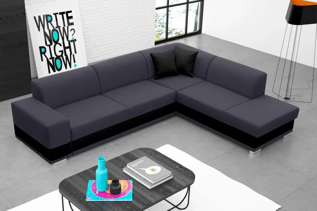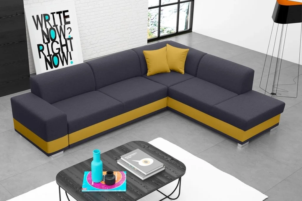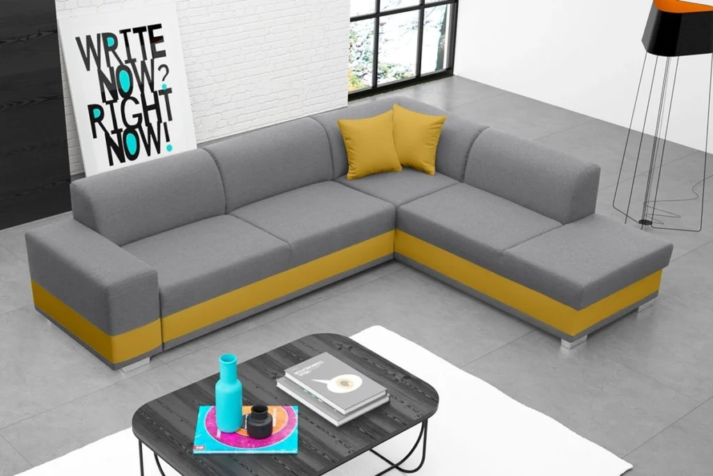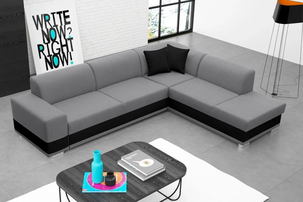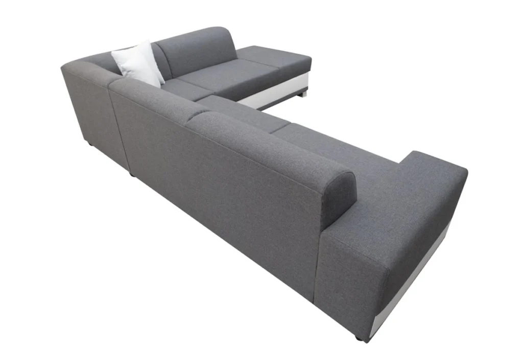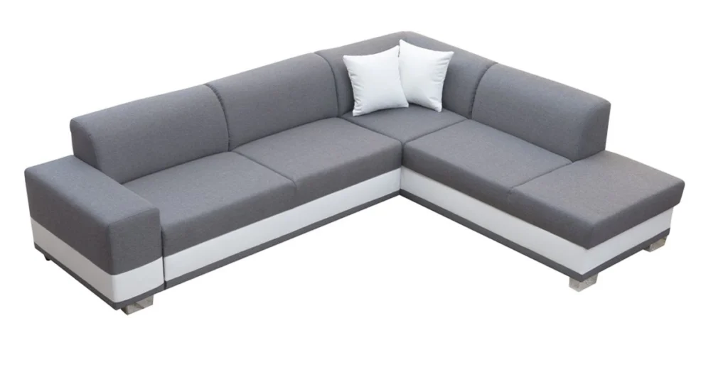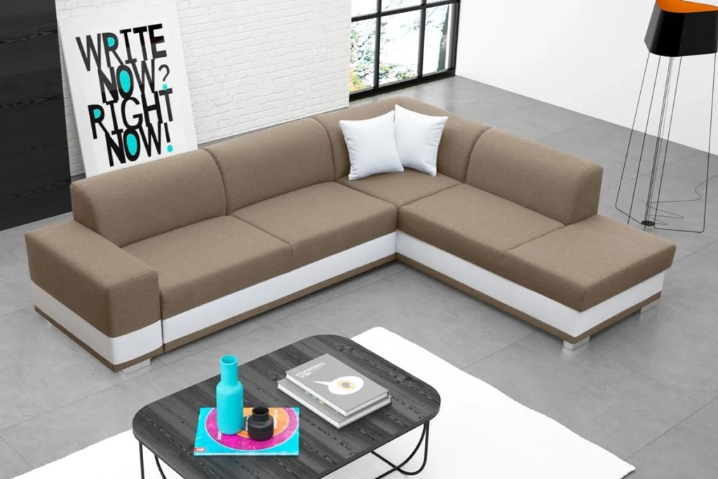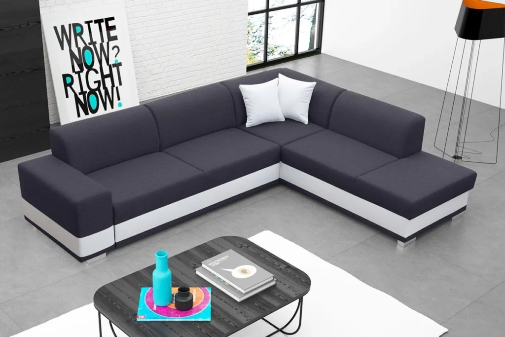 Narożnik wykonany jest z tkaniny Inari natomiast pasek biały to biała mocna i gruba ekoskóra którą stosują producenci mebli oraz tapicerek samochodowych. Bardzo łatwa w czyszczeniu – wystarczy ściereczka zwilżona wodą.