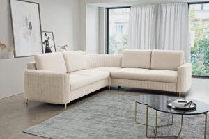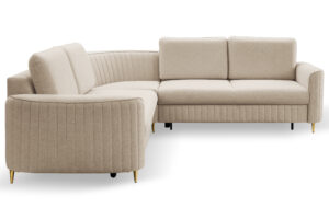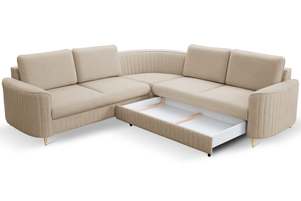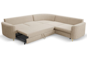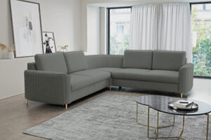 Narożnik Laren do nowoczesnego salonu z funkcją spania oraz pojemnikiem na pościel wykonany na sprężynie falistej.